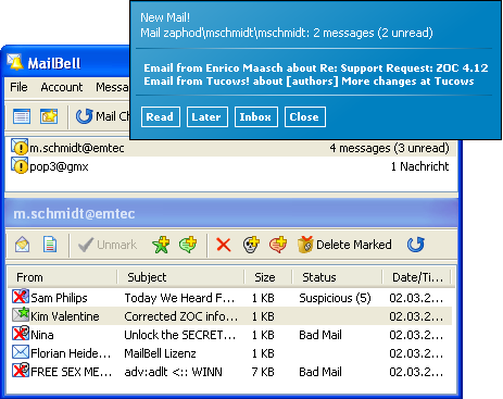 常駐系統工作列的電子郵件檢查及監視軟體,支援POP3,IMAP4及Web-Email電子郵件帳號,